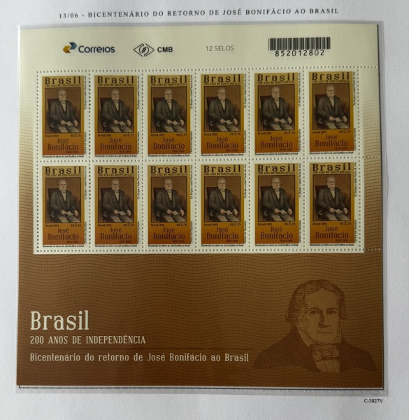 • 2019 - Comemorativo. 200 Anos da Independência - José Bonifácio. Folha c/ 12 selos + vinheta, C3827 (vide foto) - mint.