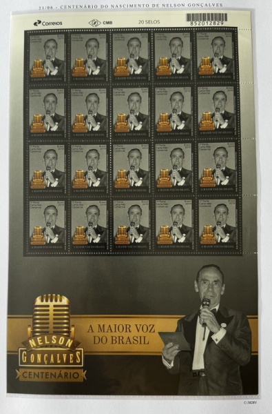 • 2019 - Comemorativo. Nelson Gonçalves. Folha c/ 20 selos + vinheta, C3828 (vide foto) - mint.