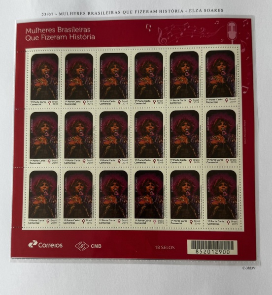 • 2019 - Comemorativo. Mulheres Brasileiras - Elza Soares. Folha c/ 18 selos + vinheta, C3833 (vide foto) - mint.