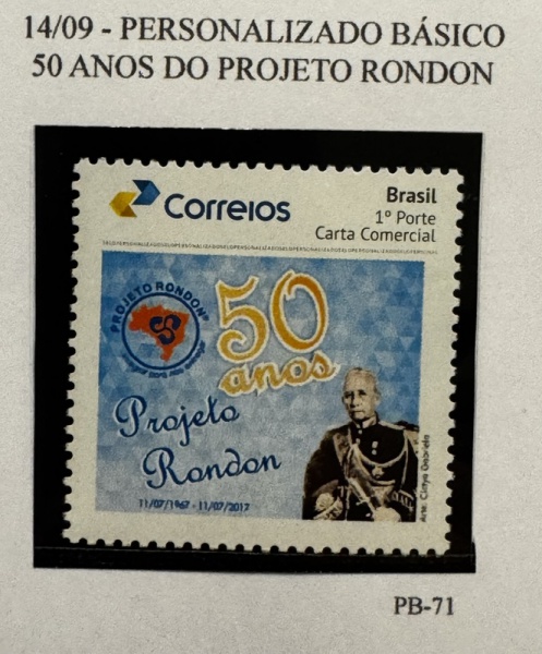 • 2017 - Personalizado Básico. 50 Anos do Projeto Rondon. PB-71 (vide foto), mint.