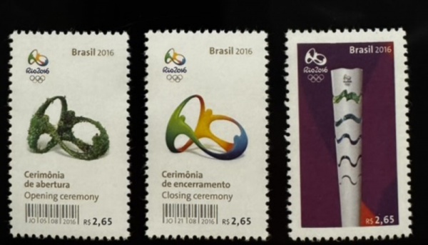 • 2016 - Comemorativo. Celebrações dos Jogos Rio 2016. 3 selos, do bloco B-195, C3624 a C3626 (vide foto) - mint (21 UF).
