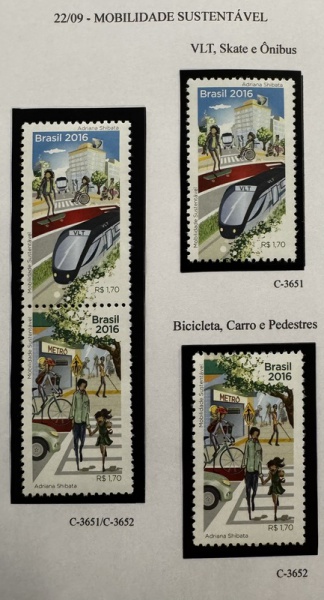 • 2016 - Comemorativo. Mobilidade Sustentável. Selos C3651 e C3652 + Se-tenant C3652 ST (vide foto) - mint (12 UF).