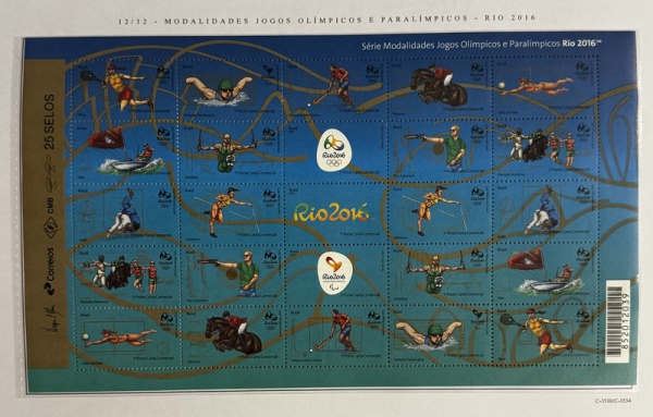 • 2015 - Comemorativo. Modalidades Olímpicas e Paralímpicas III. Folha: C3534 CJ, com selos C3510 a C3534 + vinheta (vide foto), mint (100 UF).