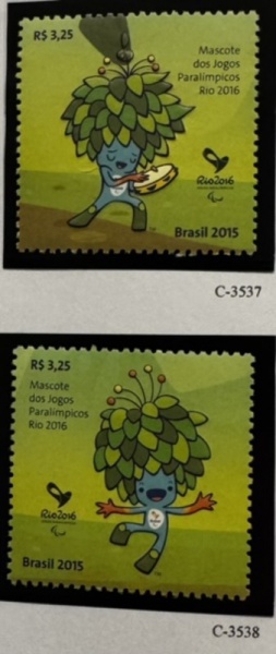 • 2015 - Comemorativo. Mascote Jogos Paralímpicos. Selos B-188, C3537 e C3538 (vide foto) - mint (24 UF).