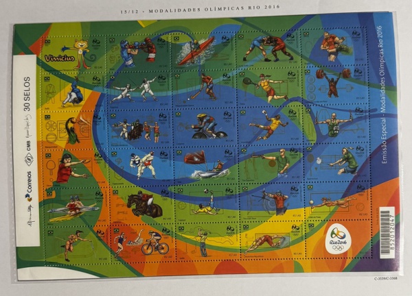 • 2015 - Comemorativo. Modalidades Olímpicas e Paralímpicas IV. Folha: C3568 CJ, com selos C3539 a C3568 + vinheta (vide foto), mint (100 UF).