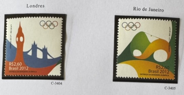 • 2015 - Comemorativo. Entrega da Bandeira Olímpica. Selos B-183, C3404 e C3405 (vide foto) - mint (50 UF).