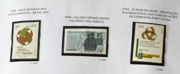 • 2015 - Comemorativo. 3 selos: C3439 (Jogos Indígenas) + C3440 (25 Anos da AICEP) + C3463 (Salário Mínimo) - (vide foto), mint (18 UF).
