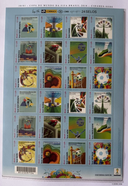 • 2014 - Comemorativo. Copa da Fifa 2014. Folha, 24 selos, C3319 a C3330 (vide foto), mint (72 UF).