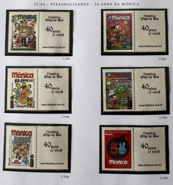 • 2014 - Comemorativo. Selos Personalizados. 50 Anos da Mônica, 12 selos + 12 vinhetas, C3336 a C3347 (vide foto), mint (360 UF).