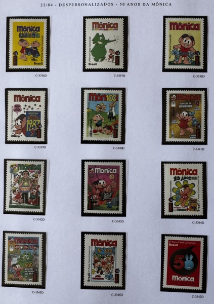 • 2014 - Comemorativo. 50 Anos da Mônica, 12 selos, C3336D a C3347D, despersonalizados (vide foto), mint (360 UF).