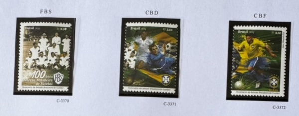 • 2014 - Comemorativo. Cent. da Seleção Brasileira. Selos C3370 a C3372 (vide foto), mint (15 UF).