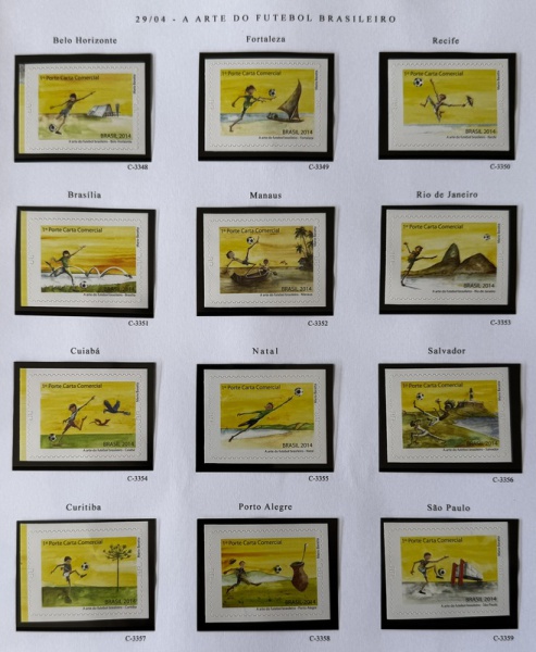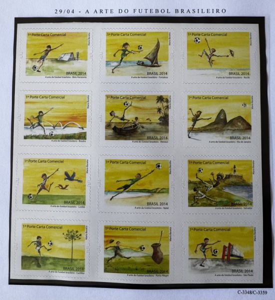 • 2014 - Comemorativo. Arte do Futebol Brasileiro. Meia folha, Conjunto 12 selos, C3348 a C3359 (vide foto), mint (60 UF).