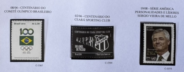 • 2014 - Comemorativo. 3 selos, C3364 (Ceará SC) + C3367 (Cent. COB) + C3375 (Sergio V. de Mello) - (vide foto), mint (14,6 UF).