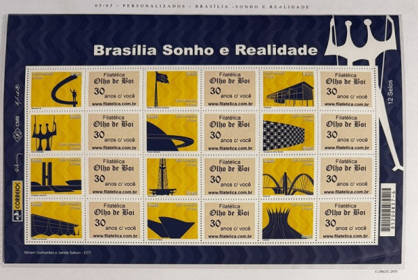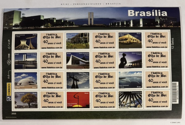 • 2010 - Comemorativo. Selos Personalizados. Brasília - Sonho e Realidade, Folha, 12 selos + 12 vinhetas, Conjunto C2973 CJ (vide foto), mint (360 UF).