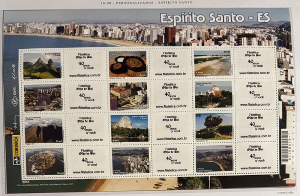• 2010 - Comemorativo. Selos Personalizados. Espírito Santo, FOLHA, 12 selos + 12 vinhetas, Conjunto C3026 CJ (vide foto), mint (360 UF).