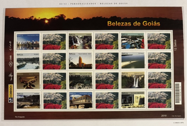 • 2010 - Comemorativo. Selos Personalizados. Belezas de Goiás, FOLHA, 12 selos + 12 vinhetas, Conjunto C3076 CJ (vide foto), mint (360 UF).