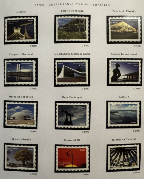 • 2010 - Comemorativo. Brasília, 12 selos, C2940D a C2951D, despersonalizados (vide foto), mint (360 UF).