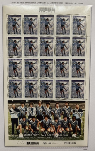 • 2001 - Comemorativo. Campeções da Libertadores, Grémio, Folha, C2406 CJ, com 20 selos + vinheta (vide foto), mint (200 UF).