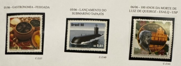 • 1998 - Comemorativo - 3 selos, C-2137, C-2140 e C-2141 - Feijoada, Tapájos e USP (vide foto) - mint (8,5 UF).
